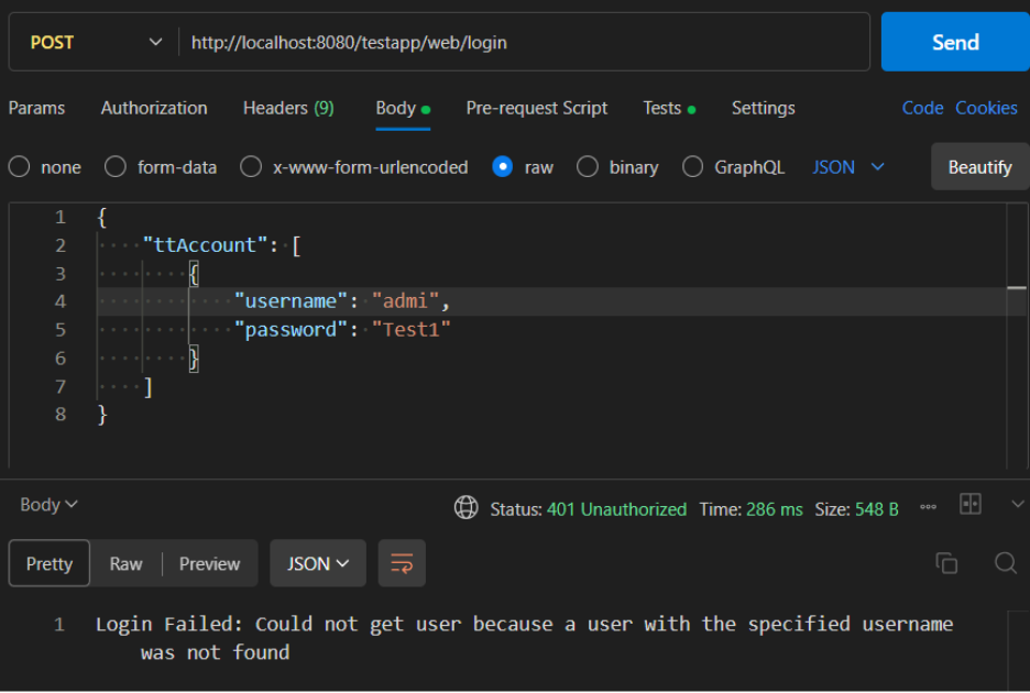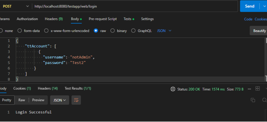 - The request body contains a JSON array named ttAccount with a single JsonObject representing the user's login credentials (username and password).