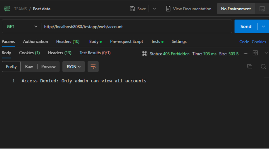 This protected endpoint is restricted to admin users. When the non-admin user tries to access it, the server checks the JWT claims and responds with: