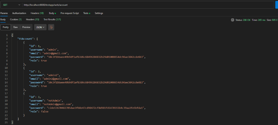 This time the JWT contains the correct admin role. The request is allowed and the server responds with a list of accounts.